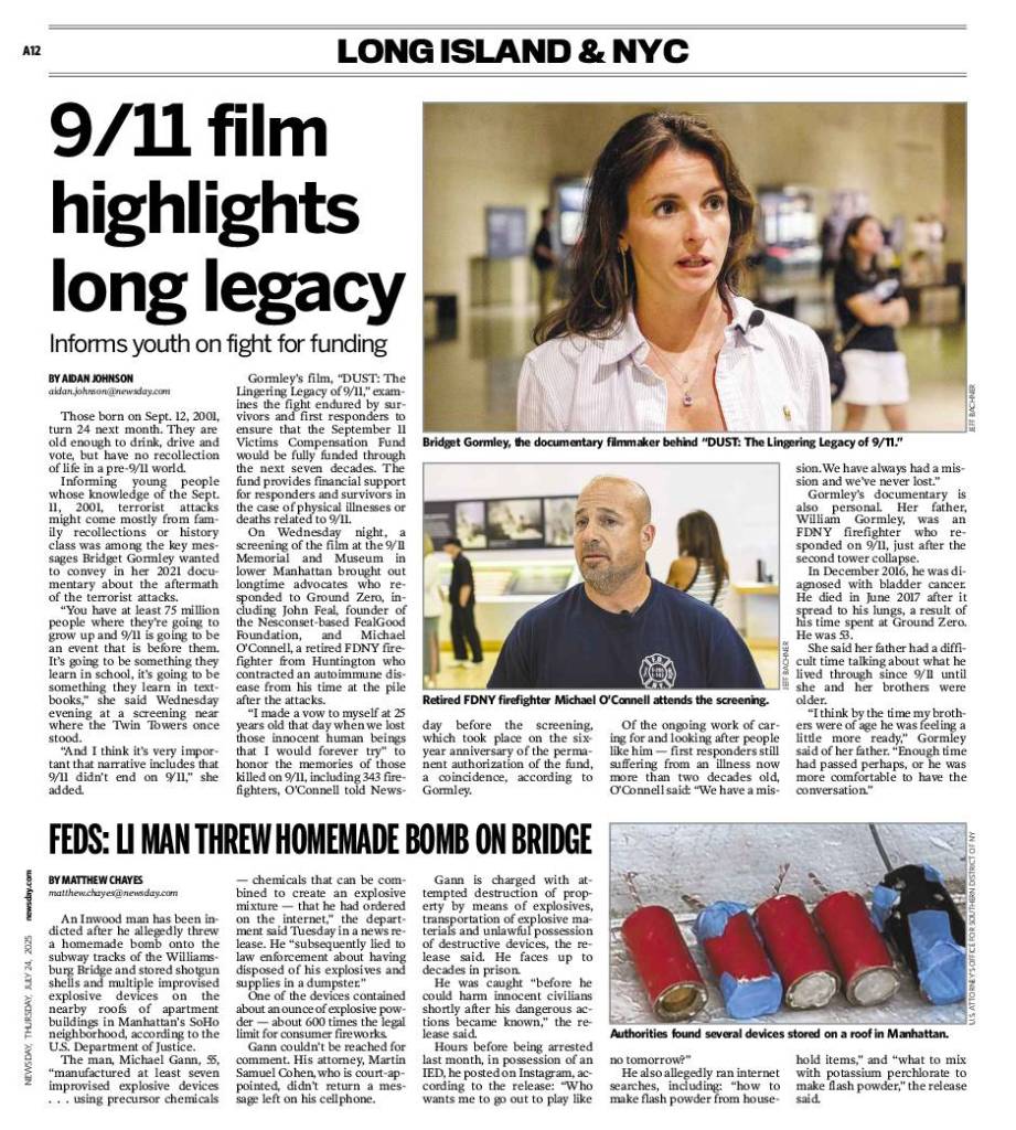Click image to view print version of: “9/11 health fund: Advocates honor living and the dead at film screening” published in Newsday on July 24, 2025.