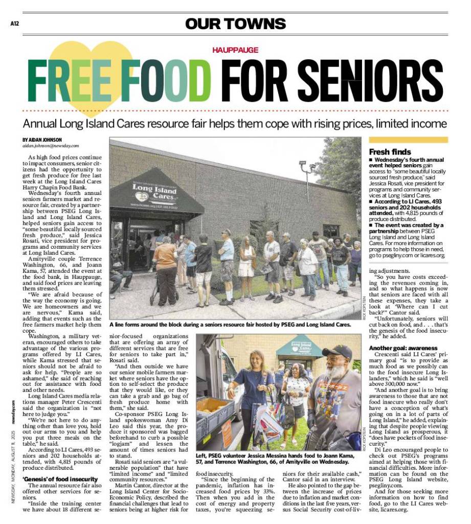 Click image to view print version of: “Seniors get free fresh produce in annual Long Island Cares fair to help them cope with rising food prices” published in