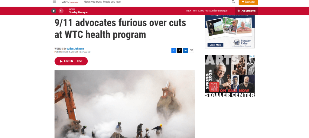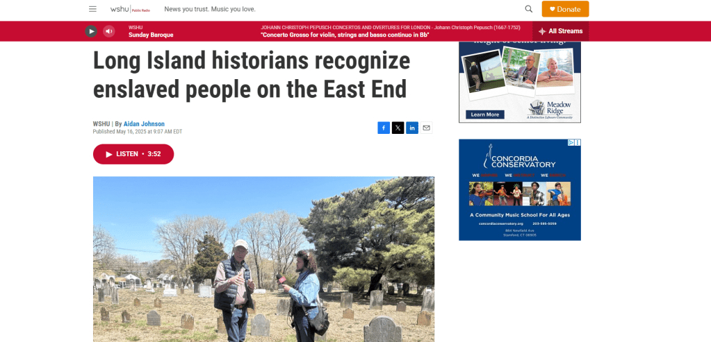 Click image to read and listen to “Long Island historians recognize enslaved people on the East End” published in WSHU Public Radio on May 15, 2025.Click image to read and listen to “9/11 advocates furious over cuts at WTC health program” published in WSHU Public Radio on April 4, 2025.Click image to listen to “Pressroom Afterhour: Democratic primary election results, ‘Nick’s Law,’ and how to beat the heat” published in TBR News Media on June 28, 2024.